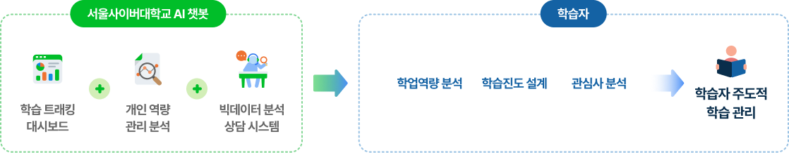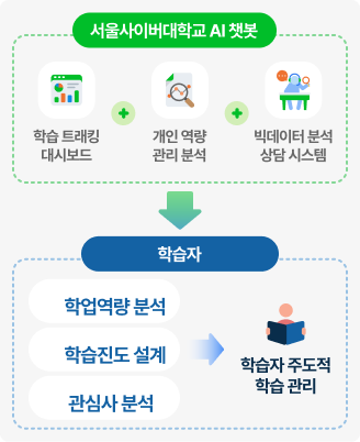 사이버대학 중 최초로 개발된 AI챗봇은 시간 제약 없이 24시간 개인 맞춤형 상담을 제공하여, 학습자가 '개인 학습 컨설턴트'와 함께 공부할 수 있는 효과를 누리게 합니다. 또한 '학습 트래킹·대시보드, 학생 역량관리 분석 시스템, 빅데이터 분석 상담 시스템'을 통해 개별 학습자의 학업 역량, 학습 진도, 관심사 등을 스스로 분석하고 관리할 수 있는 학습 환경을 제공합니다.