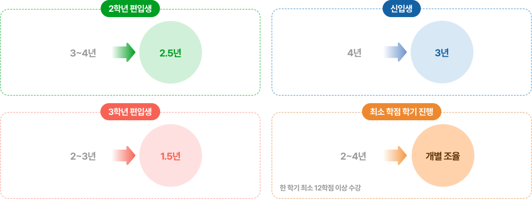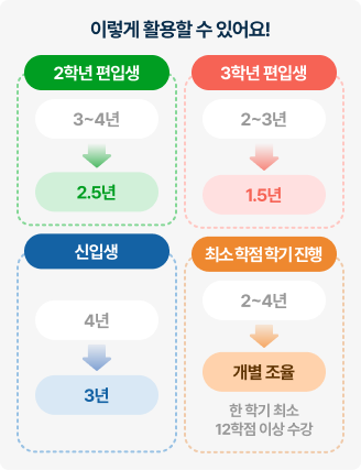 신입생은 3년, 편입생은 1.5년까지 졸업시기를 조절할 수 있으며, 필요한 경우