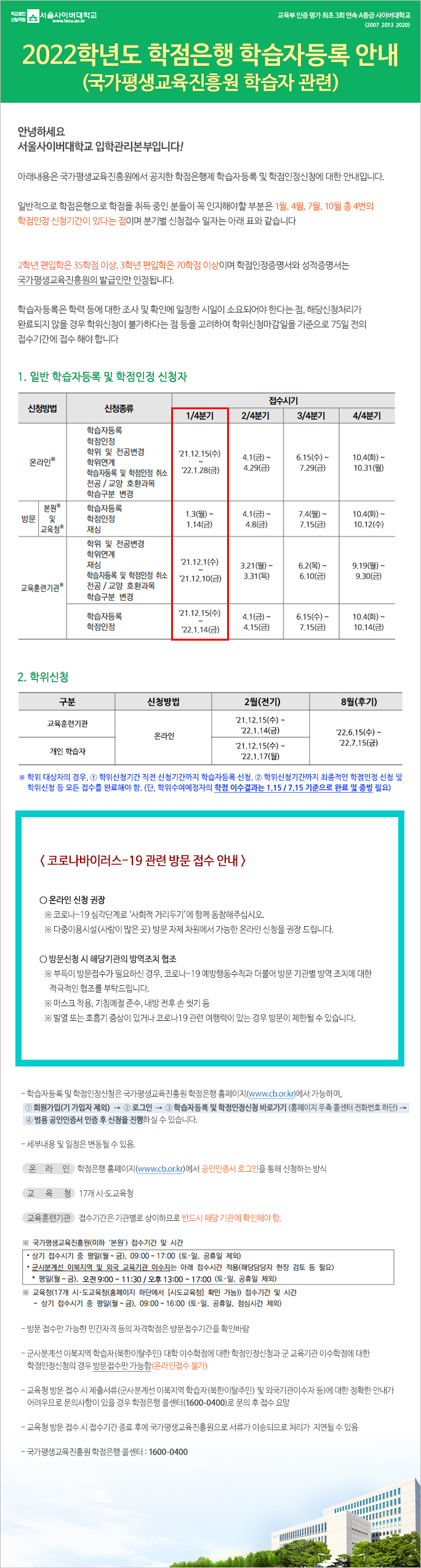 2022학년도 학점인정 신청안내(국가평생교육진흥원 학습자 관련)