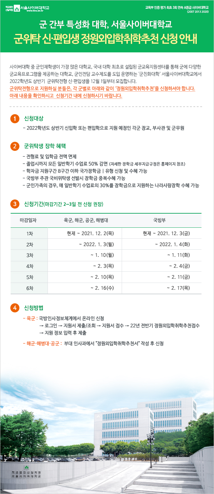 2022학년도 상반기 군위탁생<정원외입학취학추천> 신청 안내