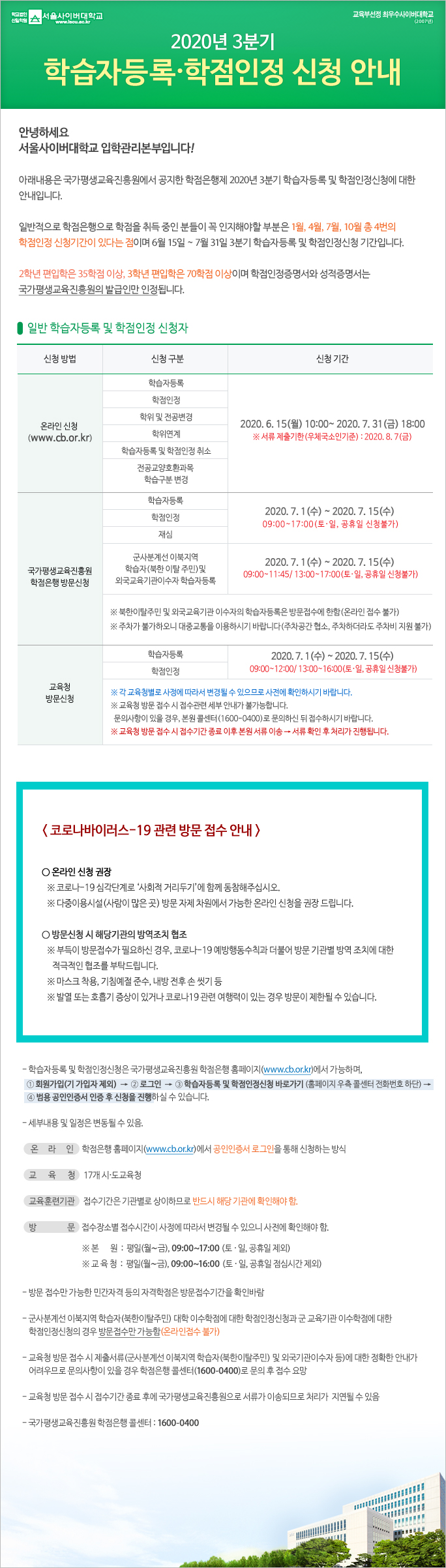 2020년 3분기 학습자등록·학점인정 신청 안내